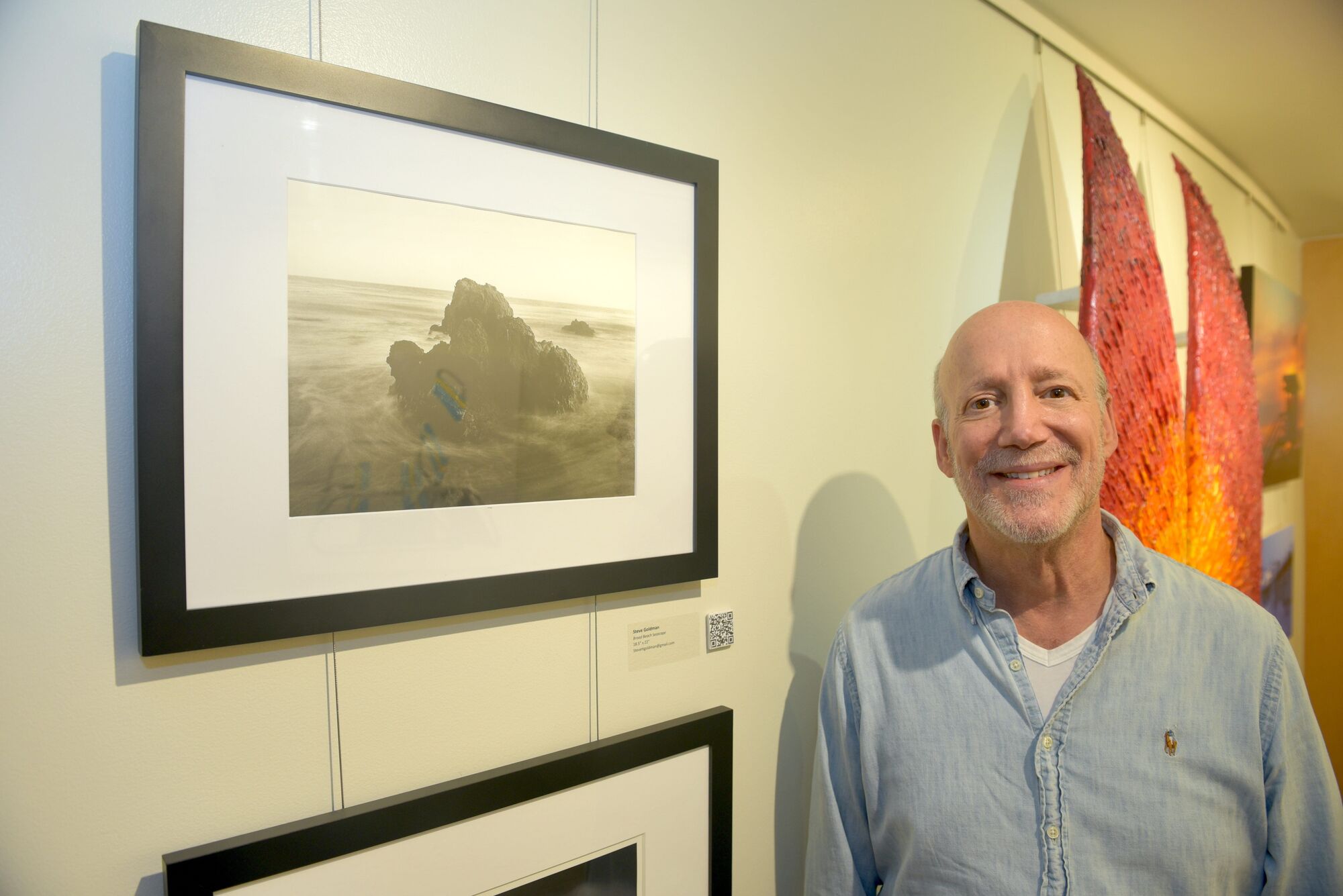 Malibu artist Steve Goldman submitted a black and white photograph called "Broad Beach Seascape" and was sharing his story behind the image to visitors at the opening reception.