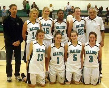The 2008-2009 Malibu High School girls’ varsity basketball team members are: (left to right, back row) Head Coach Andy Meyer, Sierra Zontelli, Amber Alexander, co-captain Dominique Magee, Carolyn Pushaw, Assistant Coach Bill Robinson, (front row) co-captain Evelyn Quartz, Hannah Robinson, co-captain Danielle Bush and Zoe Katz.
