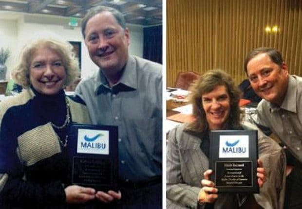 Left: Barbara Calandra, advertising director for The Malibu Times newspaper and magazine, accepts an award from Roger Gronwald, president of the Malibu Chamber of Commerce, for her five years of service with the Chamber.