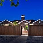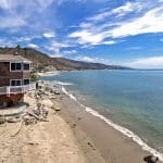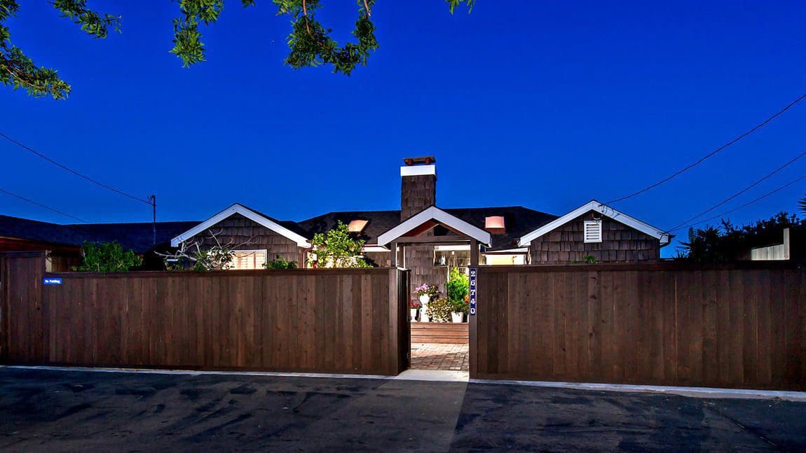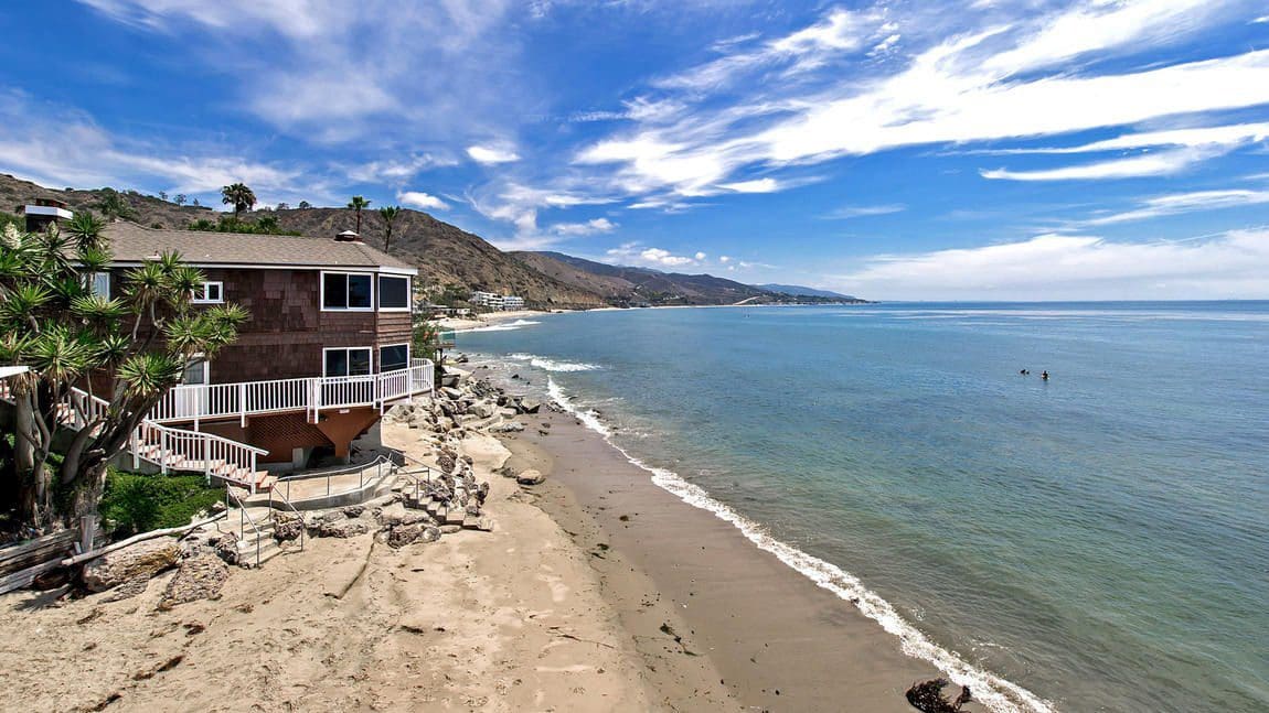 A private road directly off Pacific Coast Highway leads to the nestled entrance of the two-story beach front, Cape Cod-inspired home that includes a guesthouse.