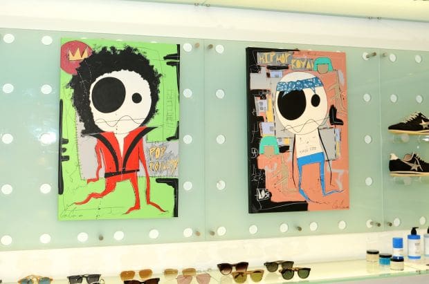 A unique aspect of the CANVAS gallery is the opportunity for each featured artist to paint a mural on the wall outside of the boutique. Forbes said, “Malibu Country Mart has allowed our exterior wall as one of the first sanctioned walls committed for public works in Malibu.” GG spent time Monday afternoon painting one of his characters on the wall outside of CANVAS, which has since been removed, but his work will continued to be featured in CANVAS through mid-August.