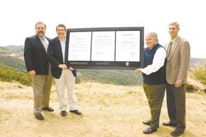 Pictured from left: Joe Edmiston, executive director of the Santa Monica Mountains Conservancy; Zev Yaroslavsky, Los Angeles County Board supervisor; Andrew Benton, Pepperdine University president; and Ed Pert, regional manager of the Department of Fish and Game, at the university’s dedication of 73 acres of open space in the Santa Monica Mountains to the Mountains Recreation Conservation Authority. Photo by Ron Hall