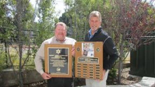 City of Malibu Parks and Recreation head Bob Stallings congratulates Dermot Stoker for being awarded the Jake Kuredjian Memorial Citizenship Award. Mayor Laura Rosenthal bestowed the honor on Stoker March 26 at Malibu City Hall for his many years of service on the city's Parks and Recreation Commission. Photo by Katie Oskie