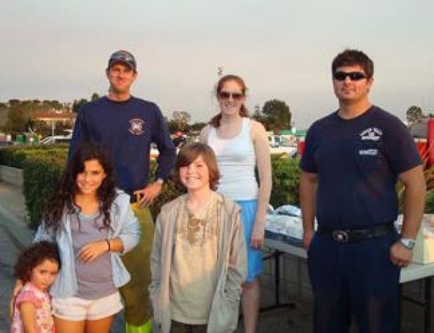 From left: Scarlet and Skylar Steinberg, Aaron Sorochinsky and Rebecca Gray join two firefighters to distribute food to the men and women fighting the Canyon Fire. Several neighbors made hundreds of sandwiches, which they delivered along with platters of donated food from Costco and Paradise Cove Café.
