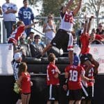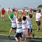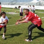 Camp participants compete for a pass in the end zone.