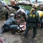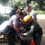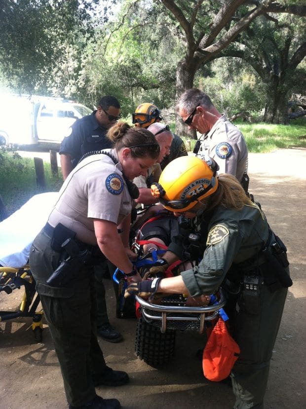 “He was … packaged by rescue personnel with full C-spine precautions and then placed in the Sheriff’s Malibu Search & Rescue litter and carried out of the back country area by the team, to an awaiting ground ambulance,” according to a release from the Search and Rescue team.