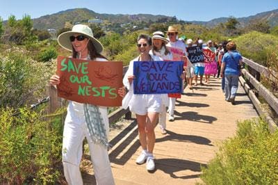 About 25 people walk across wooden bridges in the Malibu Lagoon Sunday that would be removed as part of the California State Parks restoration project, set to begin Friday or Monday. The protesters held signs and marched in the silent protest. Julie Ellerton / TMT