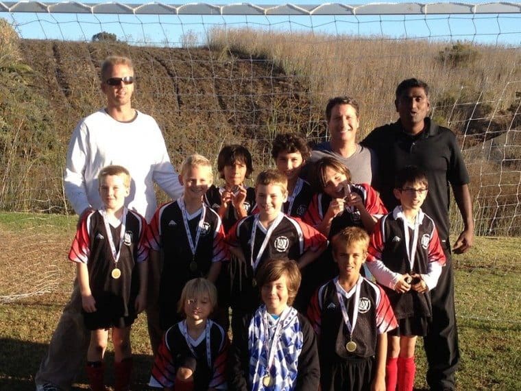 The Rhinos (back row, from left) coach Jon Krawczyk, Aiden Gunasekera, Diego Franco, coach John Franco, coach Sid Gunasekera, (middle row) Ethan Readyhoff, Jak Krawczyk, Stefan Colburn, Zennon Ulyate- Crow, Jett Kletter, (front row) Fletcher Shumow, Garen Harper and Jared Hughes celebrate their big win.