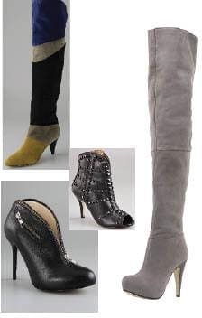 Clockwise, from top left: Francesca suede boots by Loeffler Randall, $895 at shopbop.com; Taylor peep toe booties with pyramid studs by Twelfth St. by Cynthia Vincent, $295 at shopbop.com; Britany leather thigh-high boot by TopShop, also in black, $250 at topshop.com; Perine zip front pump by Paul & Joe Sister, $504 at shopbop.com