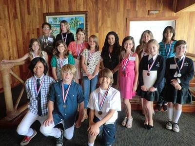 Right: Fifth-grade winners (in alphabetical order) Sage Biheller, Ava Bode, Sabine Buchwald, Luca Alfaro-Dyszkant, Jessica Ford, Nikki Gelb, Kaia Gerber, Hannah Hannley, Jack Hughes, Alex Jemelian, Karen Lopez, Stephanie Maldonado, Dylan Omelia, Mia Ross, Kennesaw Eaton-Steinberg, Buckley Ventress show off their new medals. Photos courtesy of Malibu Woman’s Club