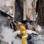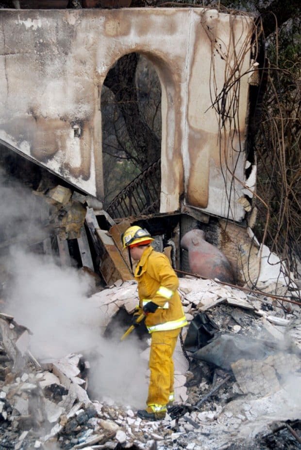 Scott Durbin of the Hemet Fire Department puts out remaining smoking embers at a home in Latigo Canyon.Photo by Janet Laird / TMT