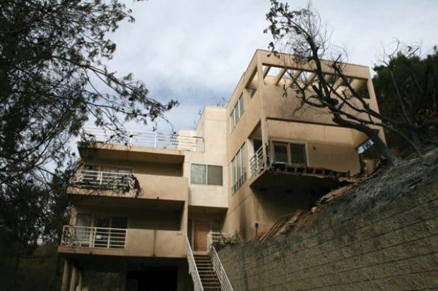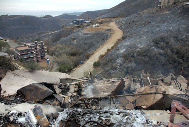 Right: A view of Corral Canyon with a burned out home in the forefront, and several in the distance that were saved. Photo by Janet Laird / TMT