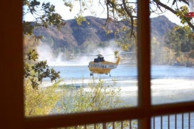 My house shakes whenever fires break out in Malibu. Here is a picture taken from my living room. Choppers are picking up water from Malibou Lake to fight Corral Canyon Fire. www.savethemeadow.com