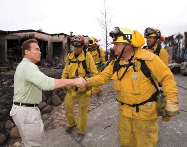 Gov. Arnold Schwarzenegger tours a fire damaged neighborhood in Malibu on Sunday. Photo by William Foster