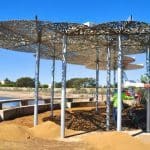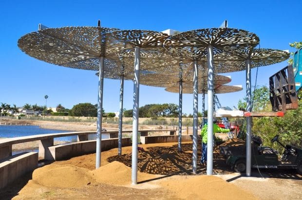Workers at the Malibu Lagoon project site this week put up a metal shade structure, one of the several features State Parks officials have touted as a means of improving the educational experience for students who visit the lagoon.