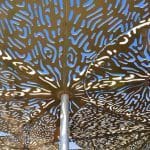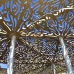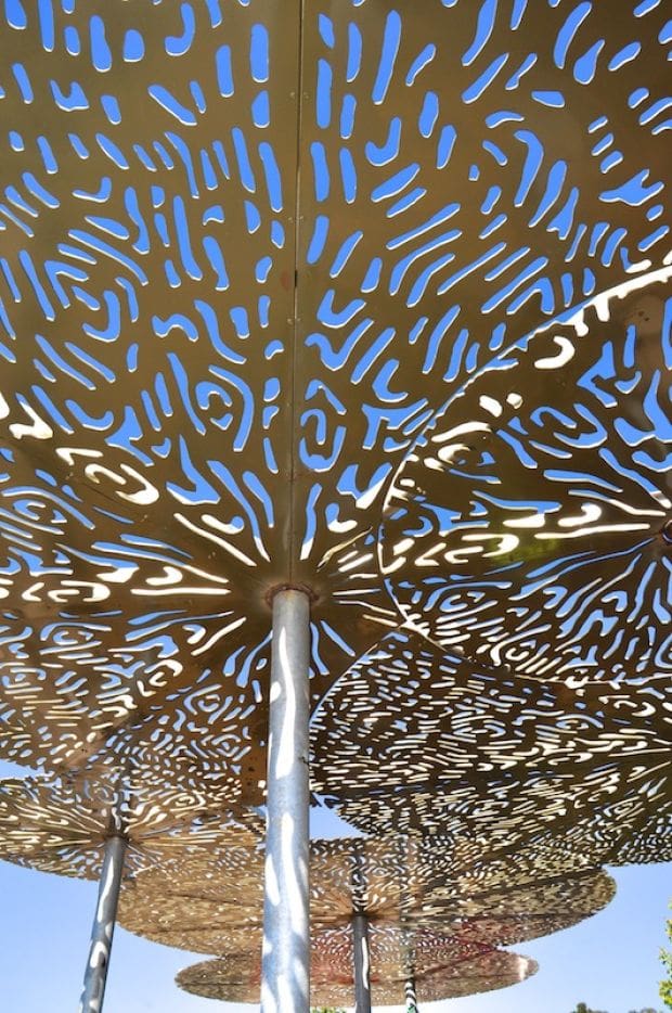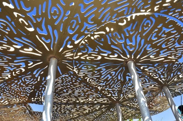 The structure is designed to make shadows look like kelp when the sun shines through carvings in the metal. It sits above an outdoor classroom area where students will be able to sit and observe the lagoon, according to officials.Â