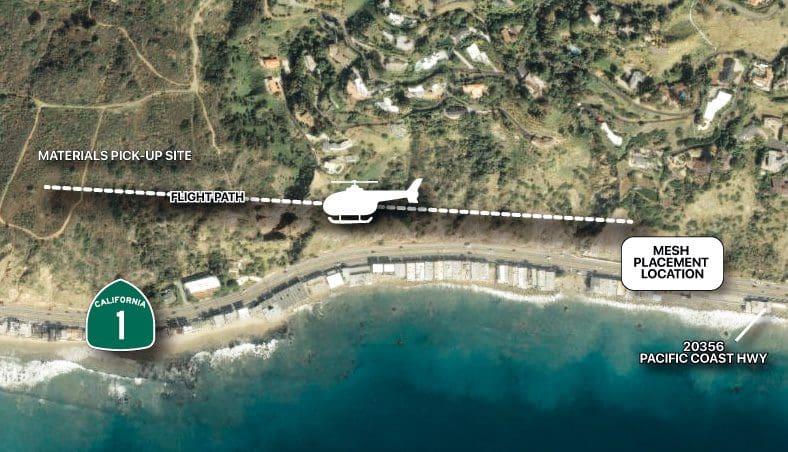 Caltrans is set to conduct a two-day helicopter operation on Wednesday and Thursday, July 30–31, to install protective rockfall mesh on a cliffside above Pacific Coast Highway (PCH), approximately half a mile north of Big Rock Drive. The work is part of an emergency slope restoration project stemming from extensive damage caused by the 2023 winter storms.
