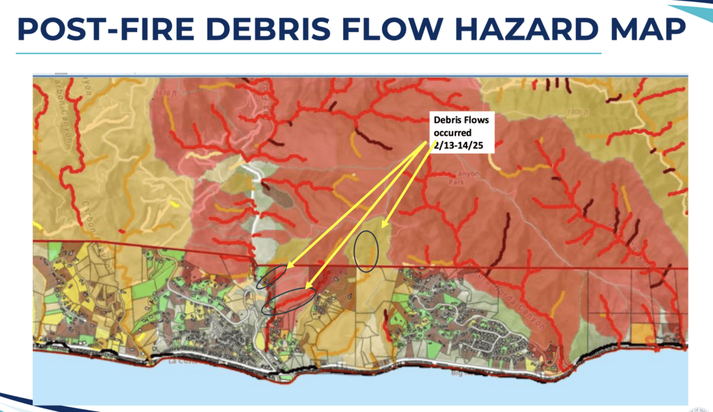 Officials discussed the city’s streamlining protocols, which provide for multi-parcel geotechnical and topographic surveys that could save those who are rebuilding both time and expense. City staff noted that landslide study reports will be madeavailable to design-build professionals and homeowners to facilitate expeditious rebuilding. The city and its consultants discussed the existing landslide inventory map. Officials noted that if a parcel’s conditions mandate that it is unwise or untenable to build a like-for-like replacement home within the footprint of a destroyed structure, the city will afford the latitude needed to substantially relocate existing homes elsewhere on a property if that can be done safely.