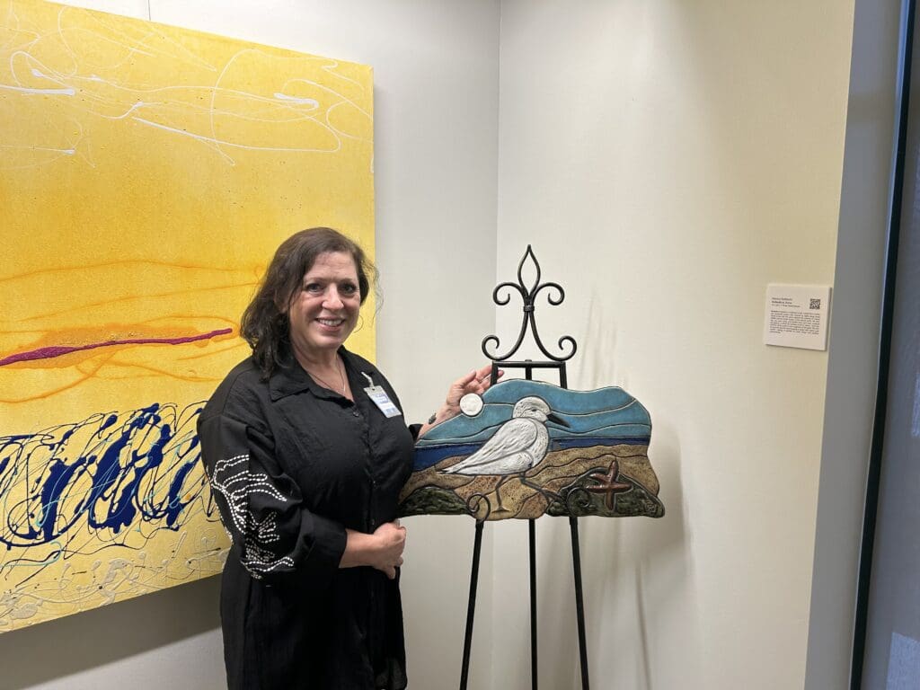 Ceramicist Monica DeMoulin’s “Birdwalk at Zuma” was inspired by “all those different textures and colors that you see on the beach.” Each piece of her mosaic was hand-crafted separately, sculpted, glazed, fired, and then fused together for a three-dimensional feel. DeMoulin explained, “The sea star, the moss-covered rocks, the sand, the ocean, and the sky, just kind of capture the typical scene at low tide on Zuma Beach.”