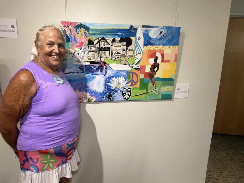 Denise Peak recreated a collage she made earlier that was burned in the Woolsey Fire. From memory and a photo, she painted images of her son Skylar surfing, a plumeria farm her family had on Molokai, a lotus flower, Wylie’s Bait Shop, and more. “I’ve always loved the bait shack and ironically, I did this before it burned down,” Peak detailed.