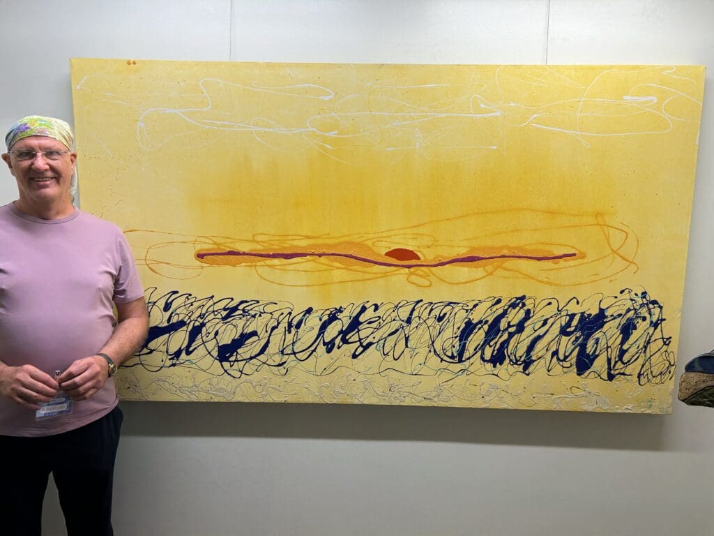 Artist Gay Summer Rick lost her Malibu home and studio, damaged in the Palisades Fire. But, she said, “I keep thinking about of all of this beauty in Malibu and how the hills are becoming green again. I can see the ocean and the colors are kind of dreamlike. My work is dreamlike, yet familiar. It’s kind of representational abstract. It’s much more abstract than usual. I think that’s because of what we’ve been going through. I want to paint more about the natural beauty where we are. And that’s what this exhibit is about, our beautiful city by the sea.” Her piece is titled “The Golden Sun.”
