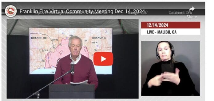 News Franklin Fire Virtual Community Meeting: Dec. 14 at 6 p.m. By The Malibu Times - December 14, 2024 0 2031 FacebookTwitterPinterestWhatsApp Franklin Fire Update 12.14.24