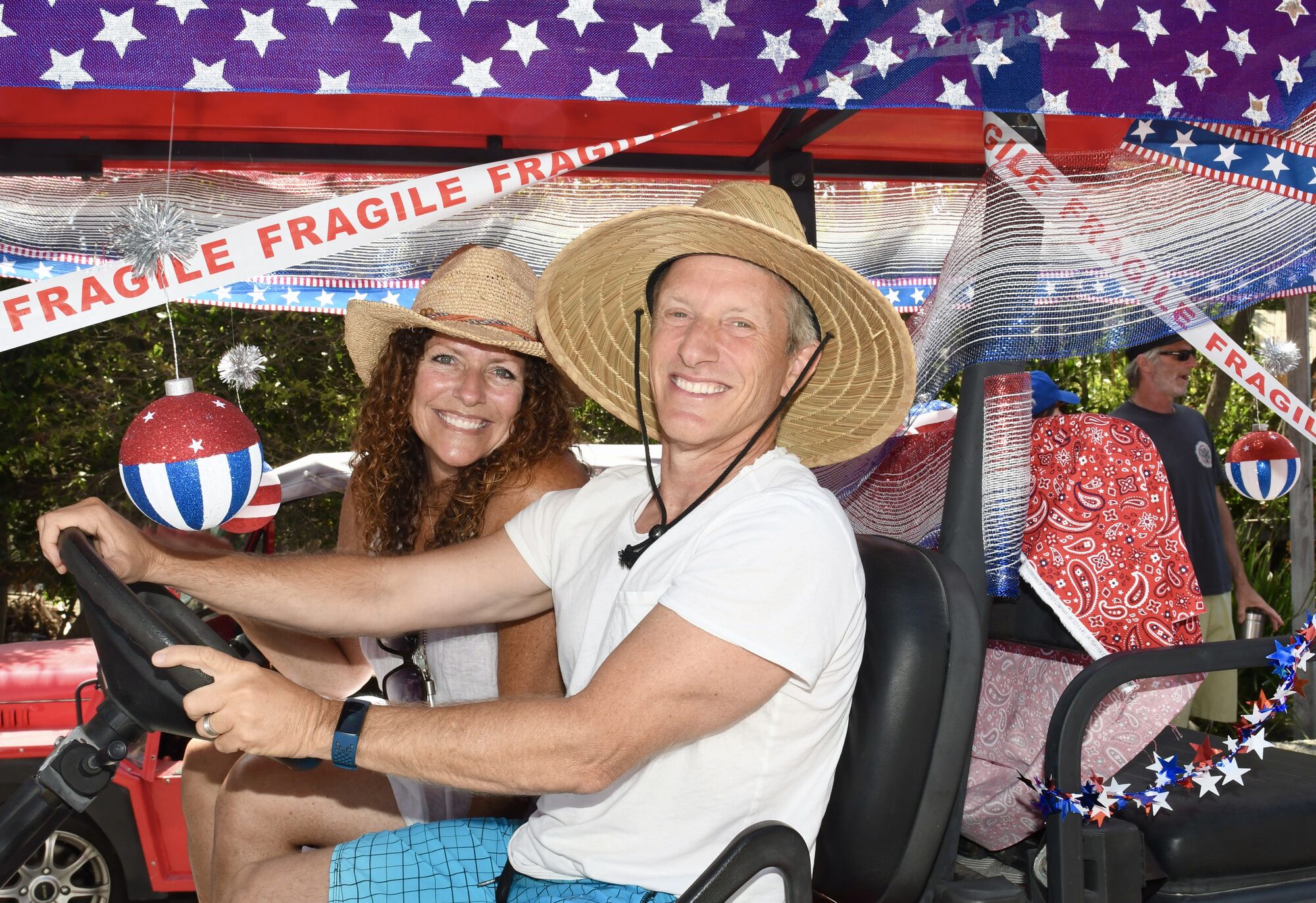 Decorated golf carts, bicyclists, vintage autos, kids on skateboards, families, dogs, and horses lined up at Bluewater and Birdview for the start to march and wind through the streets of the tightknit coastal community. Some threw candy to supportive neighbors and guests waving flags on the sidelines who cheered them on. Some used the opportunity to hold signs seeking freedom for reproductive rights.