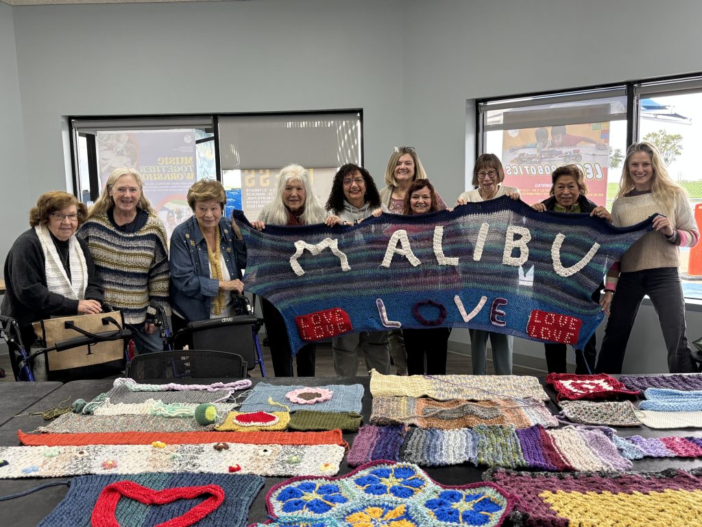 Members divvied up the work, taking on crafting granny squares and lettering for the messages to be displayed. Other members sewed pieces together to make a banner, flowers, and pompoms. The display, similar to a banner, was put up Monday. “It says ‘Malibu Love’ in crotchet lettering,” Jensen revealed. Additional yarn medallions and decorations accompany the largest piece all handcrafted by members of the group led by Sheila Rosenthal.