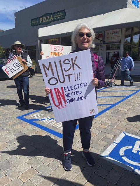 Demonstrators display their signs in front of the Malibu Tesla dealership during a Saturday, March 15, protest against the policies of the Trump Administration and Tesla CEO Elon Musk. Photos by Jane Albrecht