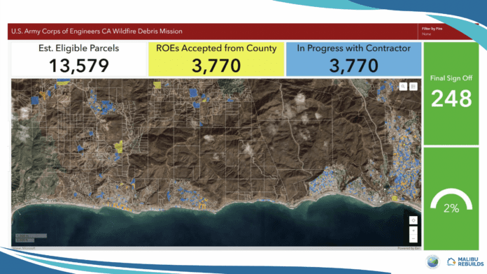 The presentation informed that the Corps’ goal for all 13,579 properties destroyed in the Palisades and Eaton fires is Jan. 6, 2026. As of now, the Corps has received 3,770 right of entrance authorizations from homeowners and has all of those “in progress,” using its 121 teams in the Palisades and Eaton fires. A total of 248 lots have been processed completely, according to the Corps. City staff noted it is not the Corps’ goal to remove seawalls or septic tanks. Homeowners are advised to provide a drawing indicating where those are located and the Corps will make a conscious effort not to damage them. Bundy noted that in Malibu, 147 owners of beach lots have opted in, 34 have opted out and 141 owners have not decided how to proceed. Bundy said her staff are contacting the 141 undecided owners, adding that, “it is safe to say that you are opting in and then you can decide to opt out later.”