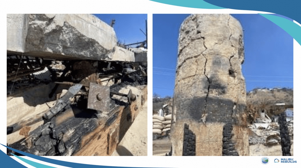 Bundy briefly discussed the effects of fire on concrete foundations, noting that concrete’s structural integrity can be significantly compromised. At temperatures above 300 F, concrete begins to lose strength and when temperatures reach 1,100 F, concrete can lose 50% or more of its original strength, making it structurally unreliable. Further, when exposed to intense heat, moisture trapped within the concrete expands, causing the surface to crack and break off chunks in a process known as spalling. Finally, Bundy noted that the reinforcing steel within concrete is also vulnerable to extreme heat causing loss of strength and elasticity, thermal expansion of steel and loss of strength between the rebar and the surrounding concrete, reducing the foundation’s stability.