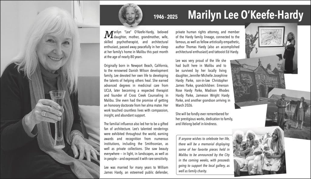 Obituaries Marilyn Lee O’Keefe-Hardy 1946-2025 By The Malibu Times - December 11, 2025 0 2567 FacebookTwitterPinterestWhatsApp Share this: Share on Facebook (Opens in new window) Facebook Share on X (Opens in new window) X Like this:Like Loading... Related