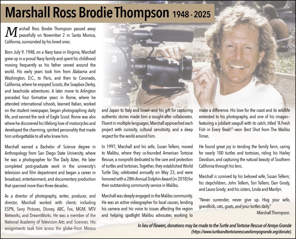 Obituaries Marshall Ross Brodie Thompson 1948-2025 By The Malibu Times - January 8, 2026 0 835 FacebookTwitterPinterestWhatsApp Share this: Share on Facebook (Opens in new window) Facebook Share on X (Opens in new window) X Like this:Like Loading... Related